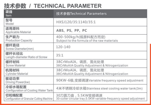 1、主機(jī)配置大長(zhǎng)徑比、帶強(qiáng)化混合結(jié)構(gòu)的排氣螺桿,保證物料高速高效混合、塑化、排氣;